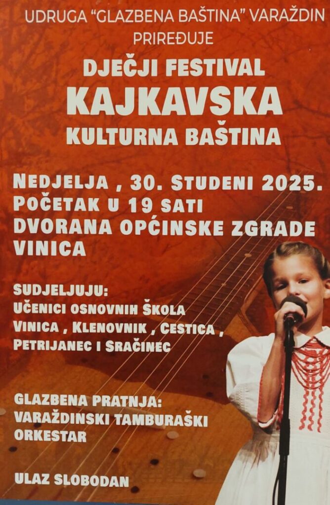U nedjelju, 30.11.2025. će se u velikoj općinskoj dvorani Općine Vinica održati DJEČJI FESTIVAL KAJKAVSKA KULTURNA BAŠTINA s početkom u 19 sati. Na festivalu će sudjelovati učenici osnovnih škola iz Cestice, Klenovnika, Petrijanca, Sračinca i Vinice. Iz OŠ Vinica nastupit će Dora Biškup, Jana Hohnjec i Gabrijela Kapljić.