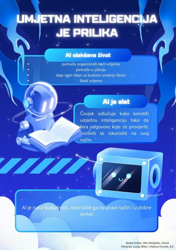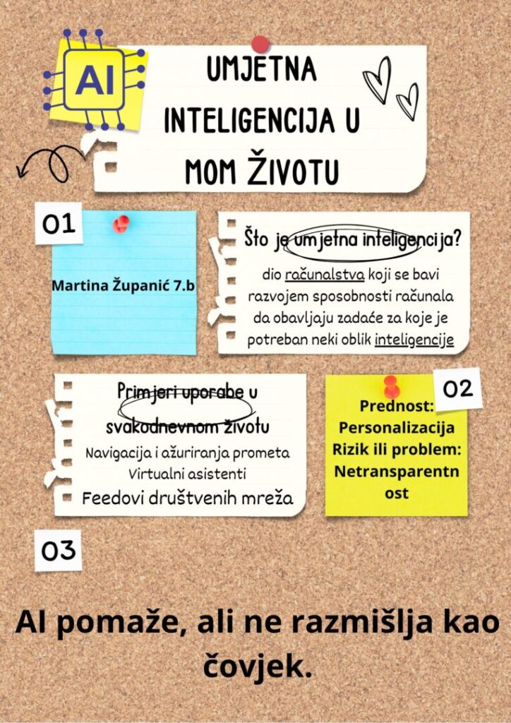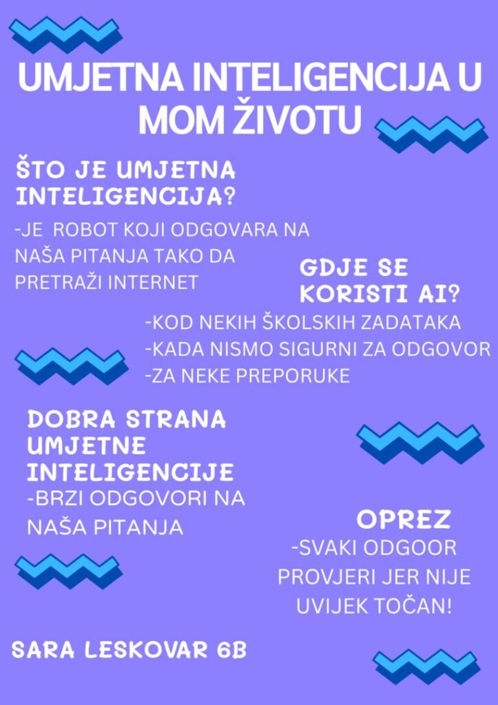 Učenici 6. i 7. razreda bavili su se temom „Umjetna inteligencija u mojem životu“. Istraživali su gdje se sve susreću s umjetnom inteligencijom u svakodnevici – od preporuka na društvenim mrežama i video platformama do obrazovnih alata i aplikacija. Poseban naglasak stavljen je na kritičko promišljanje, provjeru informacija i odgovornu upotrebu tehnologije. Učenici su kroz digitalne plakate prikazali što je to umjetna inteligencija, koje su prednosti i nedostaci korištenja i poruku upozorenja.
