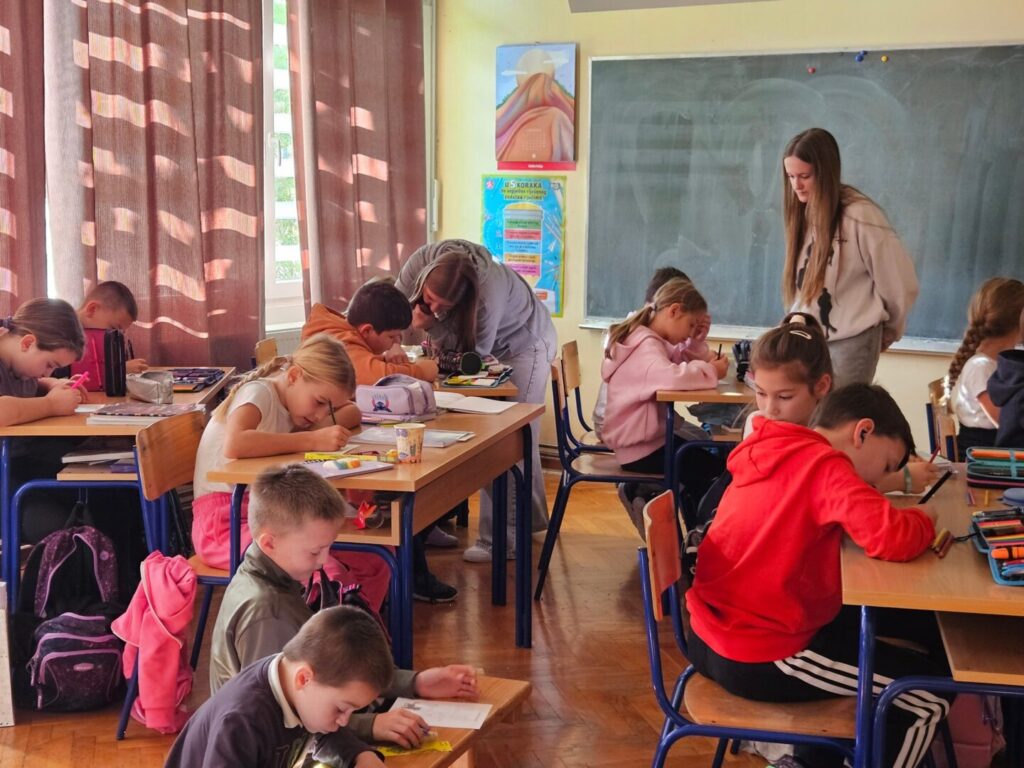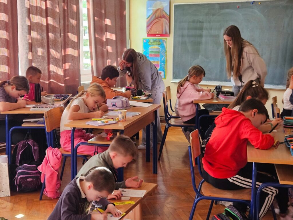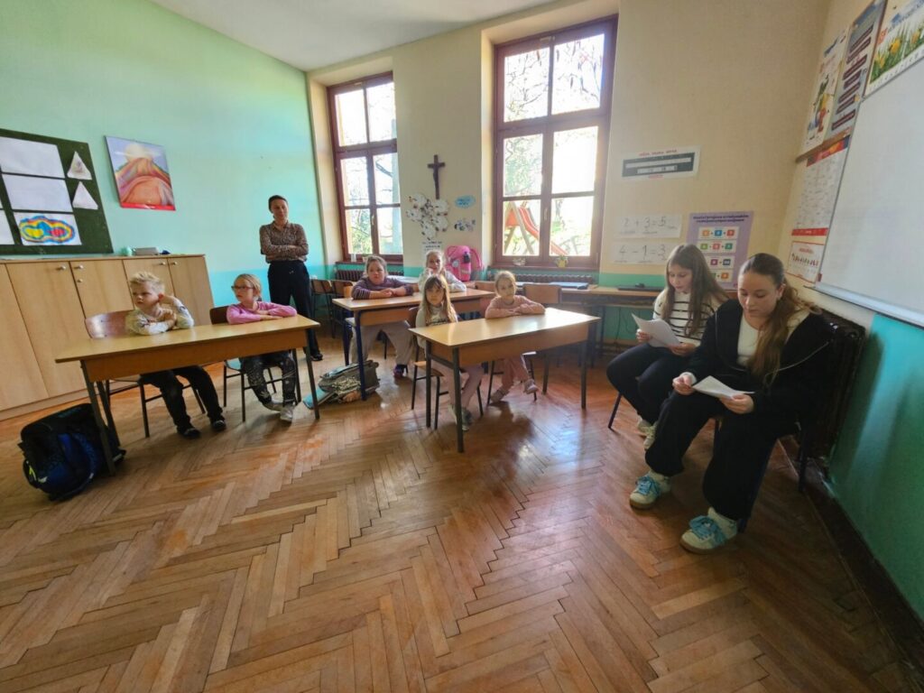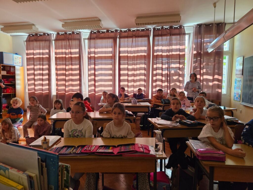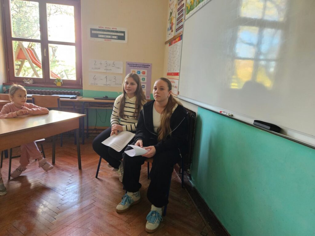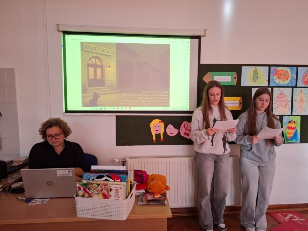 Prilikom posjeta učenice volonterke Klara, Ella, Jana i Ena pročitale su učenicima priču Oprostite, jeste li vi knjižničarka?, a zajedno su riješile i zanimljive zadatke vezane uz priču.
