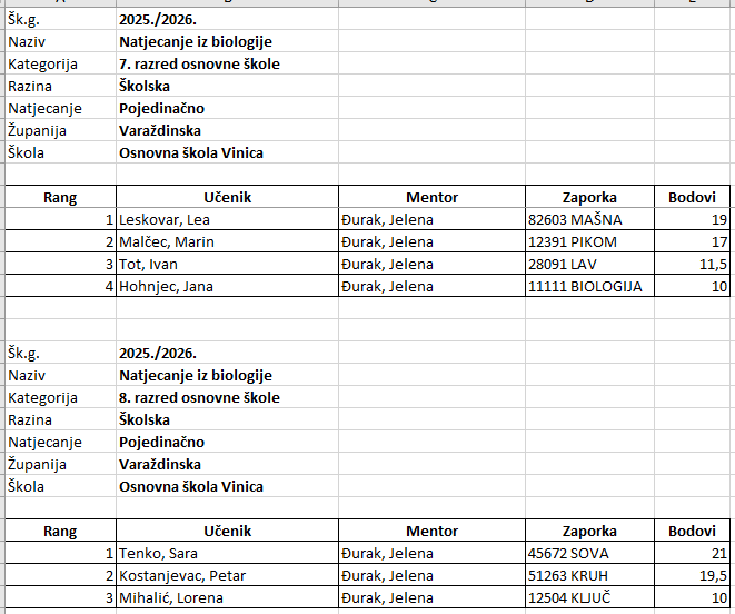 Školsko natjecanje iz biologije održano je 21.1.2026. Na njemu su sudjelovali učenici 7. razreda (Lea Leskovar, Marin Malčec, Ivan Tot i Jana Hohnjec) te učenici 8. razreda (Sara Tenko, Petar Kostanjevac i Lorena Mihalić). Mentor svim učenicima je učiteljica biologije Jelena Đurak.