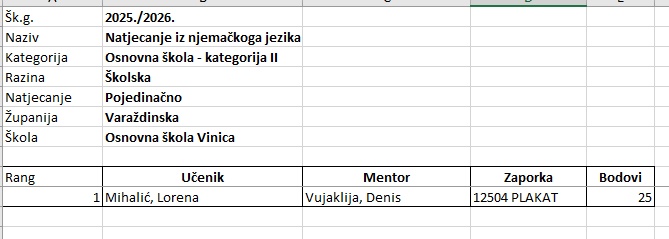 Školsko natjecanje iz njemačkog jezika održano je 20.1.2026. g. te je na njemu sudjelovala učenica 8. razreda Lorena Mihalić u Kategoriji II, a mentor joj je učitelj njemačkoga jezika Denis Vujaklija.