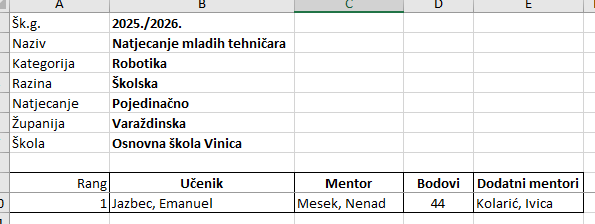 Školsko natjecanje iz robotike održano je 9.2.2026. u sklopu Centra izvrsnosti iz robotike te je na njemu sudjelovao učenik 5. razreda Emanuel Jazbec i ostvario 44 boda. Mentor mu je učitelj tehničke kulturte Nenad Mesek.