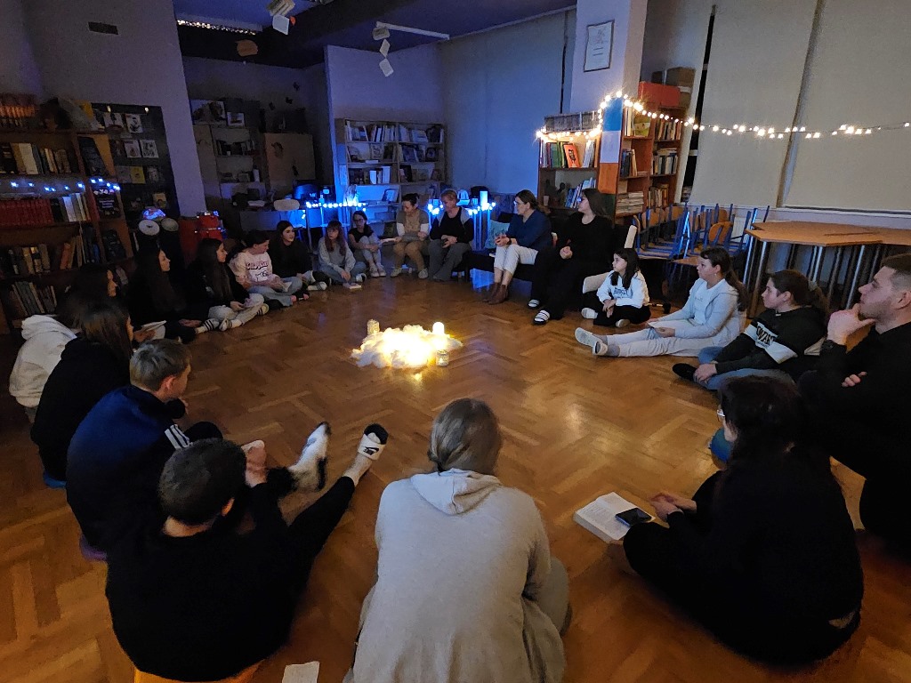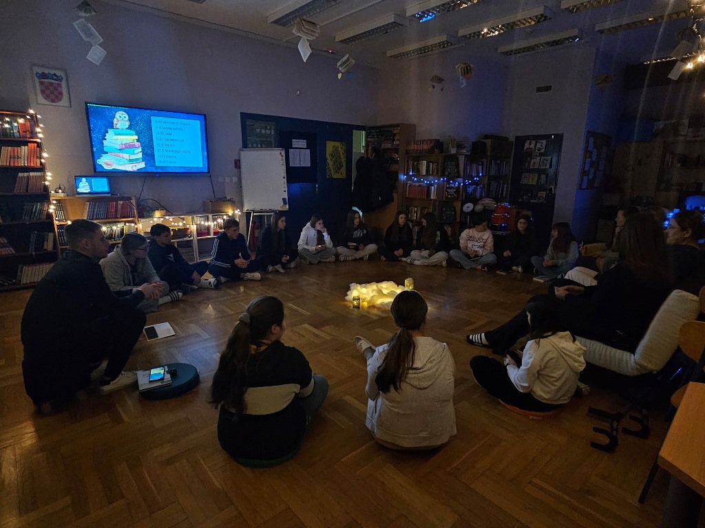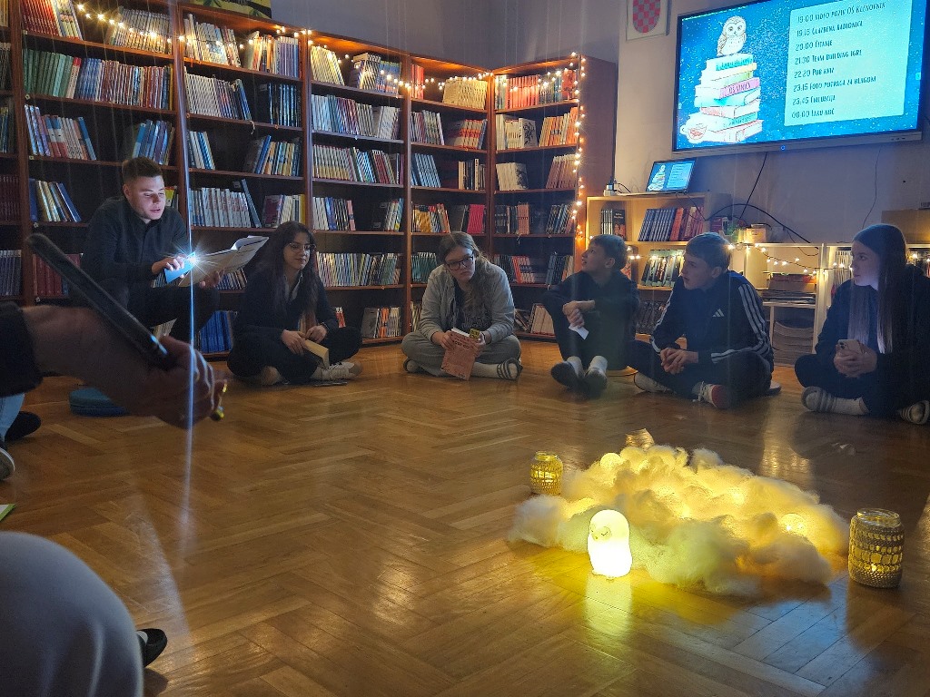 U petak, 21. studenoga održan je još jedan uspješan noćni čitateljski susret u sklopu projekta Tulum s(l)ova. Susret je započeo virtualnim druženjem s “tulumašima” iz OŠ grofa Janka Draškovića iz Klenovnika. Nakon videopoziva učenici su se opustili i razbudili sudjelujući u vrlo zabavnoj radionici bubnjanja. Aktivno su sudjelovali stvarajući zanimljive i glasne ritmove. Glavni dio susreta bio je posvećen čitanju odabranih ulomaka i pjesama po izboru samih učenika. Nakon što su izražajno pročitali retke koji su ih nadahnuli, sudionici su iznijeli svoje dojmove i razgovarali o pročitanom. Nekim su učenicima najzabavnije bile team building igre u holu škole. Kroz igre su sudionici pokazali ne samo svoju spretnost, već i kreativnost, dodatno jačajući timski duh i prijateljstva. Na kraju prije nego što su se uputili kućama “tulumaši” su odigrali pub kviz s temom knjiga. Susret je zaključen točno u ponoć kada su učenici ispunjeni dojmovima i novim čitateljskim iskustvima krenuli kućama.